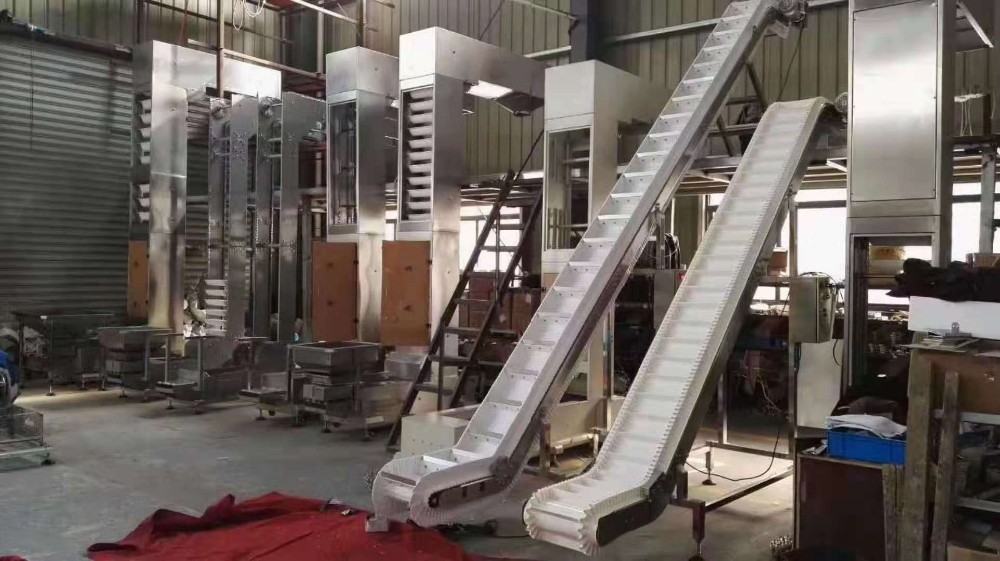 The conveyor is applicable for conveying vegetable, big size product. The product is lifted by the chain plate or PU/PVC belt. For chain plat, the water can be removed when the product is conveyed. For belt, it is easy to be cleaned.