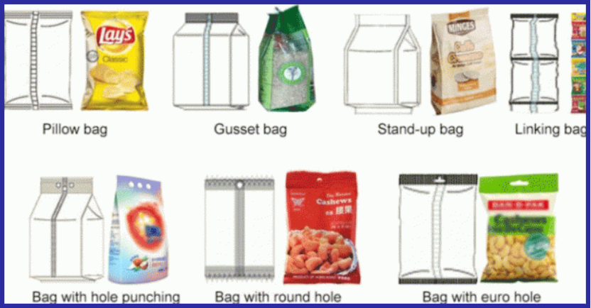 The vertical packing system is suitable for weighing and packing grain,stick,slice, globose,irregular shape products such as candy,chocolate,jelly,pasta,melon seeds,roasted seeds,peanuts,pistachios,almonds,cashews,nuts,coffee bean,chips,raisins,plum,cereals and other leisure foods,pet food,puffed food,vegetable,dehydrated vegetables,fruits,sea food,frozen food,small hardware,etc.