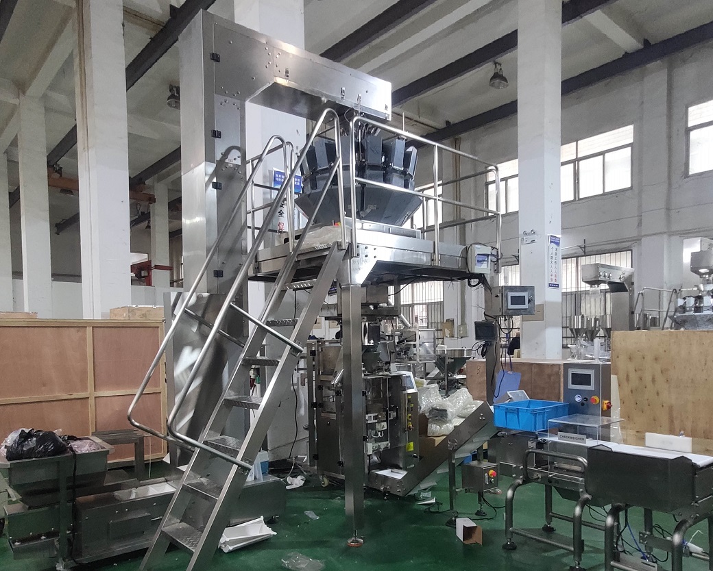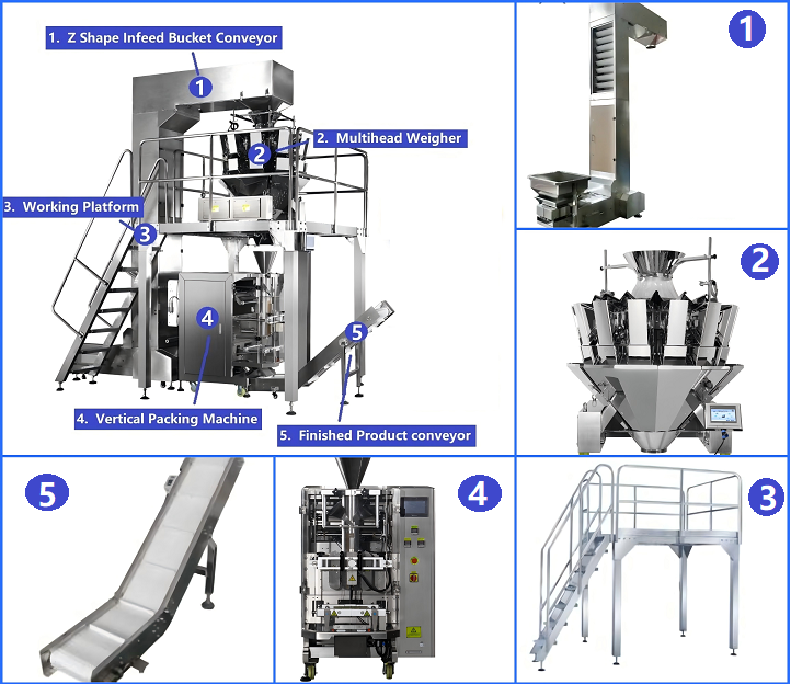 The shipment is designed for high-efficiency vertical form fill seal (VFFS) operation. The consignment includes a 14-head multihead weigher, a heavy-duty Z bucket elevator, a vertical packing machine, a metal detector, a check weigher and a customized working platform.